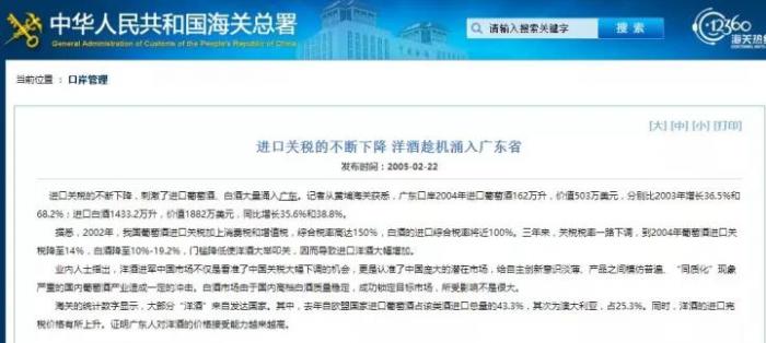 2002年至2004年期间,中国将葡萄酒进口关税从150%降低至14%,白酒类关税降至10%左右。海关总署统计,2004年广东口岸进口葡萄酒503万美元,同比增长68.2%;进口白酒1882万美元,同比增长38.8%。