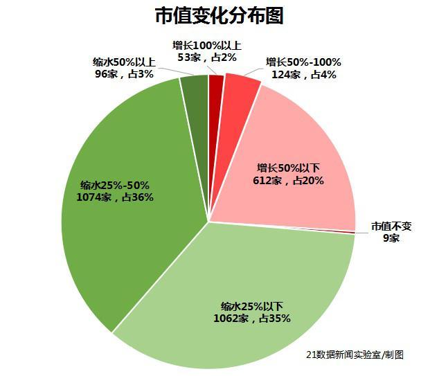 剔除今年上市的410只新股,在3030家A股上市公司中,市值实现增长的公司有789家,其中,实现了翻倍增长的公司有53家。而市值缩水的公司达到了2232家,占比73.67%。