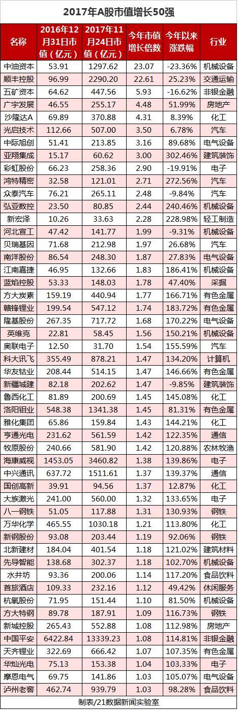 今年A股市场上有哪些公司市值大幅增长?在2017年A股市值增长50强的公司中,年内市值均实现了翻倍。