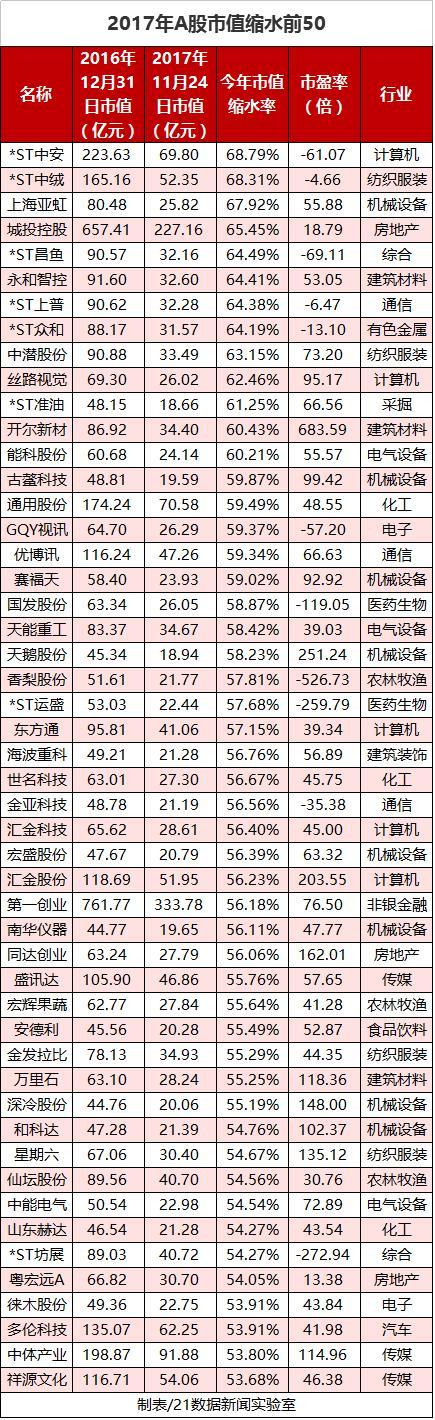 2017年A股市值缩水榜:整体缩水5.8万亿元,102家公司股价腰斩