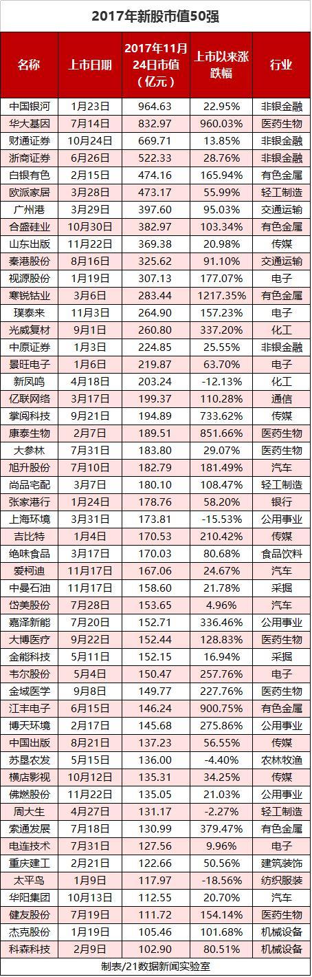 2017年新股市值50强:4家公司市值超500亿,华大基因第二