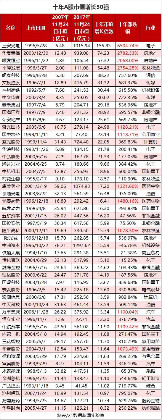 21数据新闻实验室统计出了A股十年市值增长50强(剔除借壳股),它们的整体市值从十年前的894亿元增长到如今的1.7万亿,翻了18倍。其中排第一名的是三安光电,十年来市值增长近156倍。