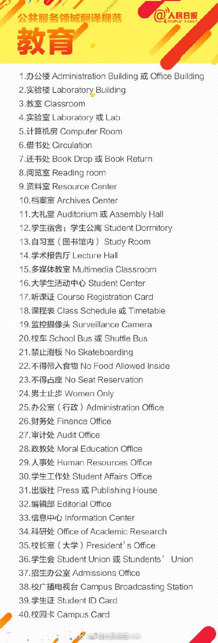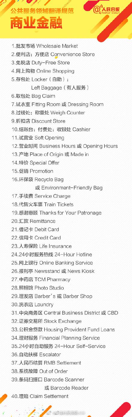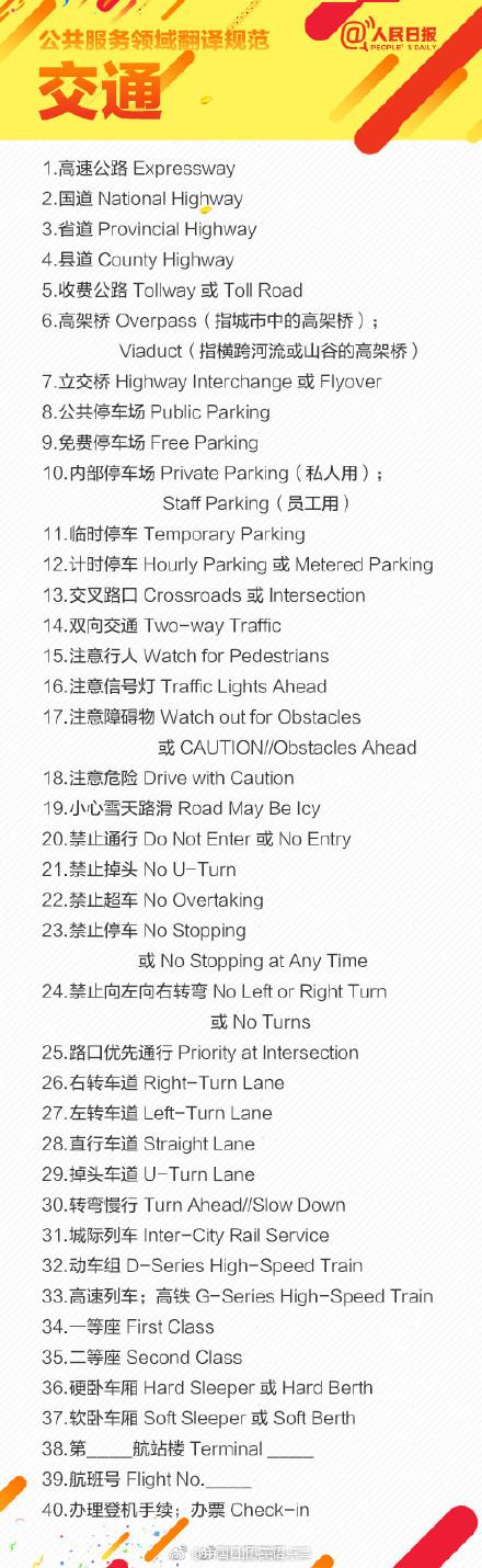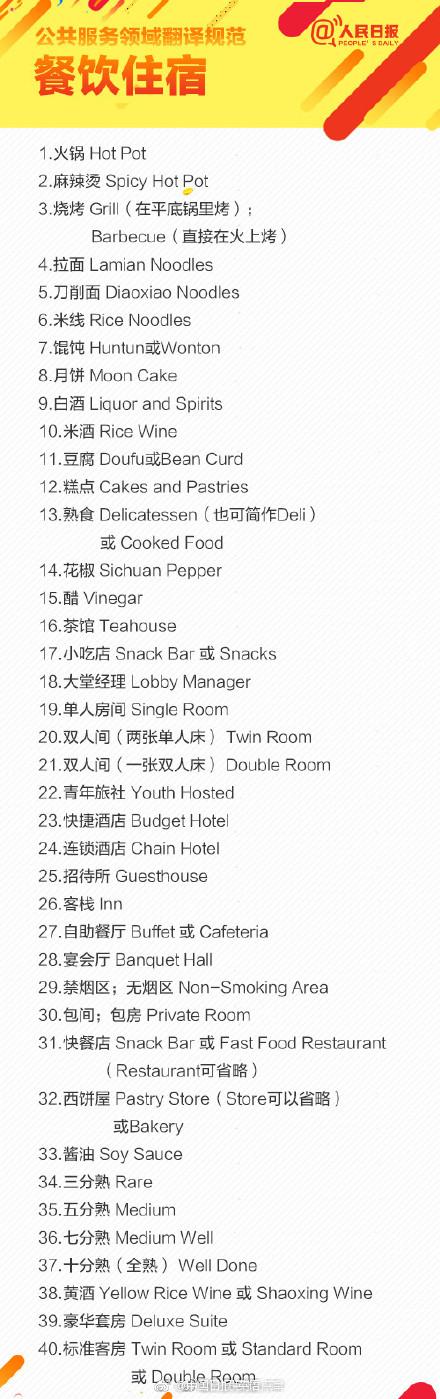 12月1日起,《公共服务领域英文译写规范》正式实施。这份涵盖交通、旅游、文化、教育等13个领域的英文译写标准,提供了常用的3500余条规范译文。麻辣烫Spicy Hot Pot,拉面Lamian Noodles,豆腐Doufu……