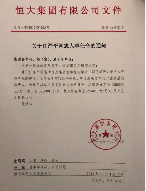 究竟哪个版本为真?还是为了辟谣5000万薪酬又重新在任命书上明确了薪酬?截至发稿,记者尚未从恒大集团获得准确消息,记者也向任泽平本人进行求证,但截至发稿,尚无回复。