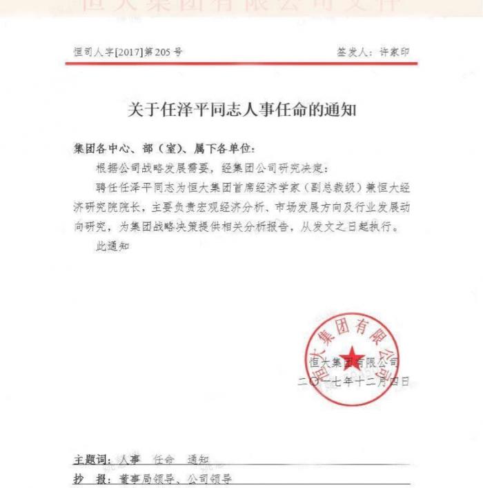 在网上流传的任命书中显示,聘任任泽平为恒大集团首席经济学家(副总裁级)兼恒大经济研究院院长,主要负责宏观经济分析、市场发展方向及行业发展动向研究,为集团战略决策提供相关分析报告。