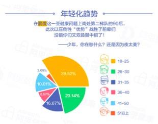 阿里零售平台数据显示:在对“失眠”一词进行搜索的用户年龄分布中,年龄段在18-25岁的90后人群占到总人群的近四成,以压倒性“优势”战胜前辈们,成为失眠大军主力。同时,年龄在18-35岁的青年用户比例近80%,即10个失眠人士当中即有8位年轻人。