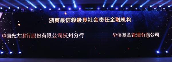 会上,2017浙商最信赖金融机构排行榜发布。凭借在财富管理领域的专业实力,以及在助力国家产业转型升级方面的有力作为,华侨基金荣膺“2017最信赖最具社会责任金融机构”奖项。此外,获奖的还有来自银行、证券、保险、信托等金融机构的龙头企业。