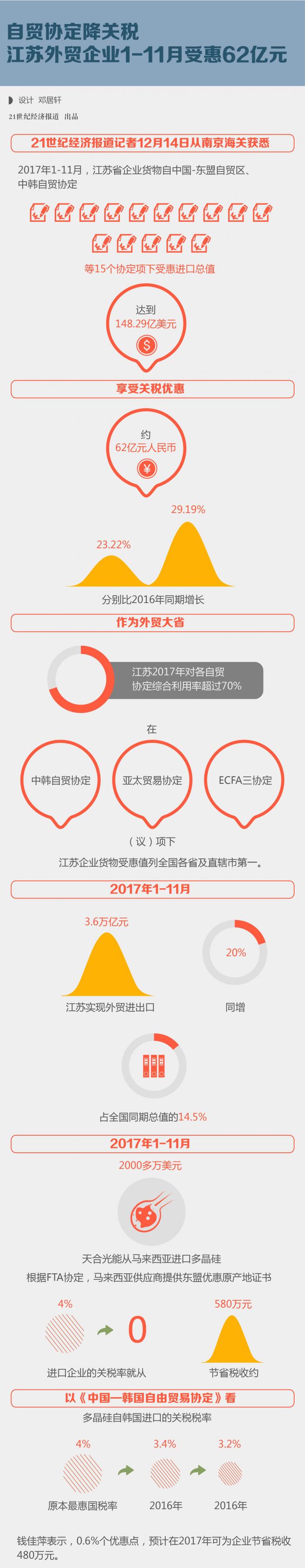 作为外贸大省,江苏2017年对各自贸协定综合利用率超过70%。在中韩自贸协定、亚太贸易协定、ECFA三协定(议)项下,江苏企业货物受惠值列全国各省及直辖市第一。2017年1-11月,江苏实现外贸进出口3.6万亿元,同增20%,占全国同期总值的14.5%。