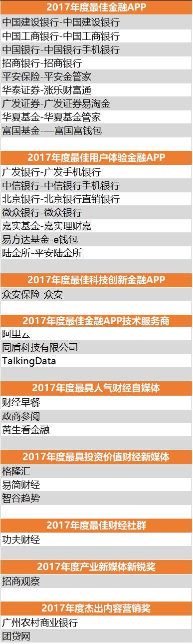 榜单奖项包括:“2017年度最佳金融APP ”、“2017年度最佳用户体验金融APP ”、“2017年度最佳科技创新金融APP”、“2017年度最佳金融APP技术服务商”、“2017年度最具人气财经自媒体”、“2017年度最具投资价值新媒体”、“2017年度最佳财经社群”、“2017年度产业新媒体新锐奖”以及“2017年度杰出内容营销奖”。