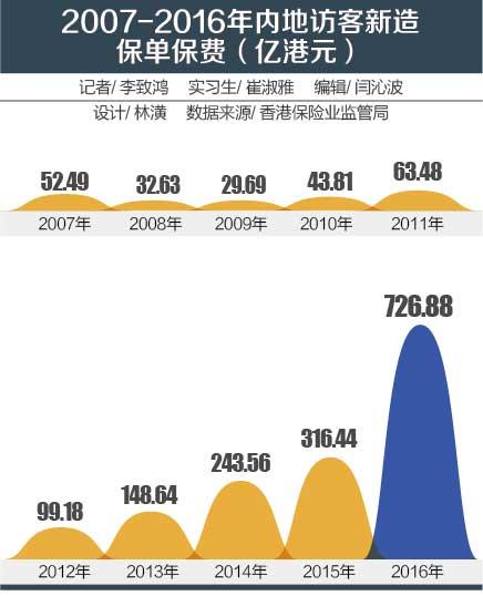 过去十年,内地居民赴港购买保险呈现逐年增长态势。香港保险业监管局数据显示,2007-2016年,内地访客新造保单保费分别为52.49亿港元、32.63亿港元、29.69亿港元、43.81亿港元、63.48亿港元、99.18亿港元、148.64亿港元、243.56亿港元、316.44亿港元和726.88亿港元。