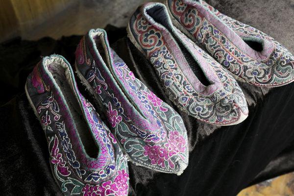 往昔的场景,现在只能通过古旧的物件来回忆。宋水仙在三都县城的收藏馆,既是水族马尾绣的博物馆,也是一座水族文化的小博物馆。这是一座两层半的木房,也是她的家。她记不清自己有多少藏品,只说至少上万件,约六成是马尾绣品,这些都是她过去走访村寨时收来的。这个收藏馆里,最多的东西是马尾绣的背带、帽子和绣花鞋。这三件东西,也代表了传统水族马尾绣的主要用途。