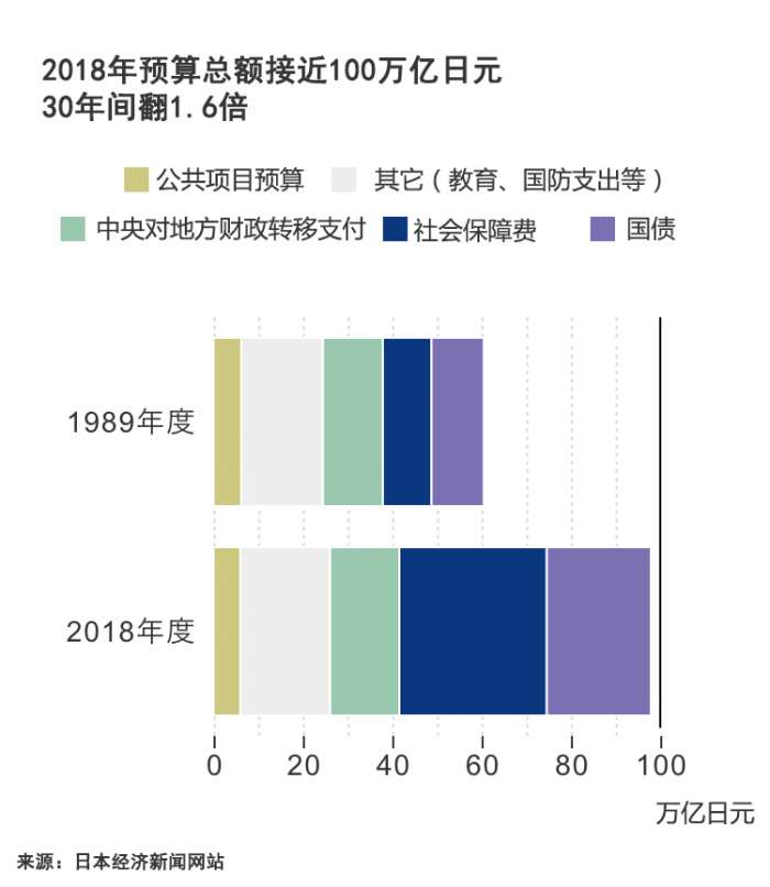 据了解,人口快速老龄化导致社会福利支出如滚雪球般增大,军费支出亦因地区紧张局势而处在纪录高位,均对该预算案带来支持。支出需求加重日本的公共财政负担。由于未能限制预算支出,外界对安倍支持财政改革的决心产生质疑。日媒报道称,日本凭借超越高速增长期“伊奘诺景气”的长期景气扩张,税收预计将增长至泡沫经济期水平,但对于财政支出的膨胀缺乏危机感。在财政纪律依然松弛的情况下,作为借款的新发国债额居高不下,达到33.6922万亿日元。安倍依赖经济增长来提高税收,以降低新的借贷;此外,他还借助日本央行的低利率政策,来限制偿还庞大公共债务的成本上升。