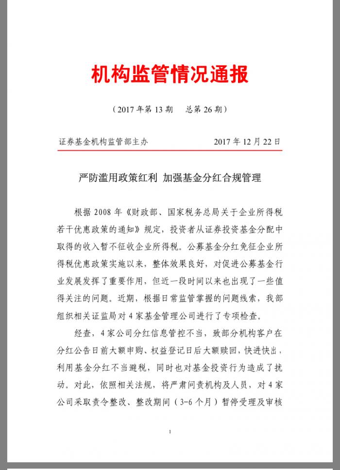 通报指出,根据日常监管掌握的问题线索,证监会证券基金机构监管部近期组织相关证监局对4家基金管理公司进行了专项检查。经查,4家公司分红信息管控不当,致部分机构客户在分红公告日前大额申购、权益登记日后大额赎回,快进快出,利用基金分红不当避税,同时也对基金投资行为造成了扰动。