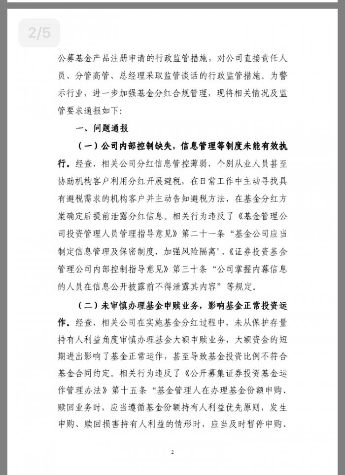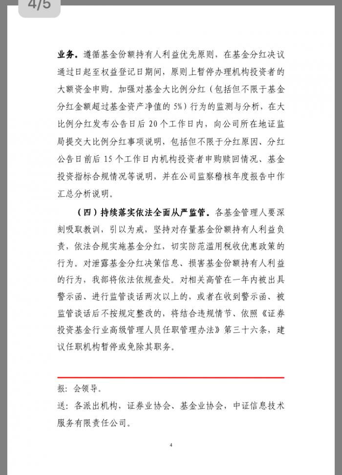 行为。对泄露基金分红决策信息、损害基金份额持有人利益的行为,我部将依法依规查处。对相关高管在一年内被出具警示函、进行监管谈话两次以上的,或者在收到警示函、被监管谈话后不按规定整改的,将结合违规情节、依照《证券投资基金行业高级管理人员任职管理办法》第三十六条,建议任职机构暂停或免除其职务。