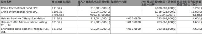 21世纪经济报道记者在香港联交所信息披露栏看到,海南慈航公益基金会控股的盛唐发展(杨浦)有限公司根据协议借出股份,由此带来股份权益性质有所改变。同时,记者注意到,中国国际基金有限公司(China International Fund SPC)持股权益在同一日增加了9.19亿股。