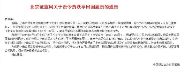 12月25日,北京证监局在官网挂出通告,要求贾跃亭于今年12月31日前回国,以此切实履行公司实际控制人应尽义务,配合解决公司问题,稳妥处理公司风险,切实保护投资者合法权益。通告认为,由贾跃亭控制的相关公司对上市公司存在巨额欠款,至今尚未归还,同时本人长期滞留海外,相关行为已经严重侵害了上市公司的合法权益及广大投资者的切身利益,社会影响极其恶劣。