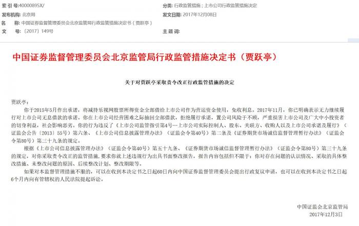 此外,在12月3日,针对贾跃亭失约将减持资金无偿借予乐视网一事,北京证监局亦同样发文称,对前者进行了包括责令改正的监管措施,以及要求贾跃亭就上述违约违规行为出具书面整改报告的行政处罚。