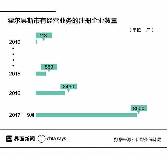 2015年起,前往霍尔果斯注册的公司数量骤升,2017年1至9月的注册企业是2016年全年的3.4倍。