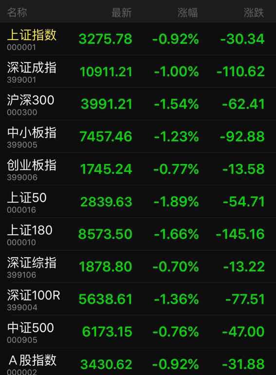 截至收盘,沪指报3275.78点,跌0.92%,成交额1983亿。深成指报10911.21点,跌1.00%,成交额2118亿。创业板报1745.24点,跌0.77%,成交额543亿。