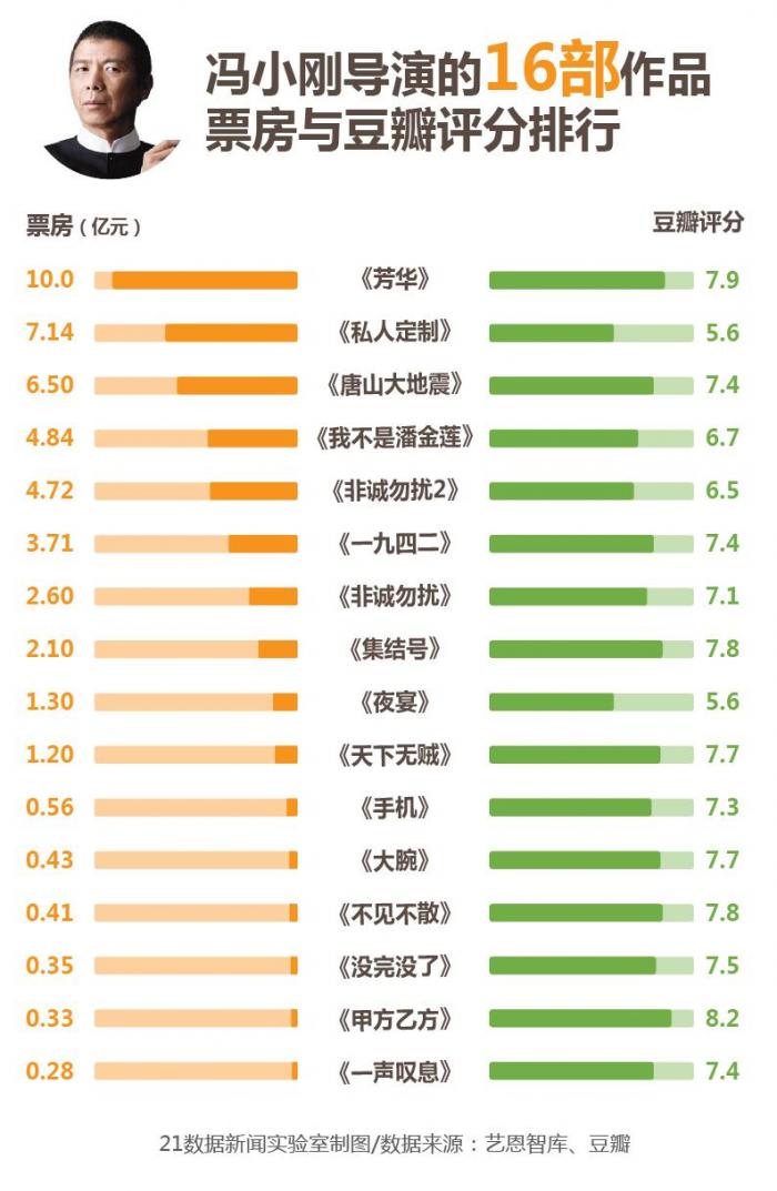 据21数据新闻实验室统计,自1997年的《甲方乙方》开始,冯小刚在近20年里一共执导了16部电影,主要为贺岁档影片,累计票房已超过40亿。