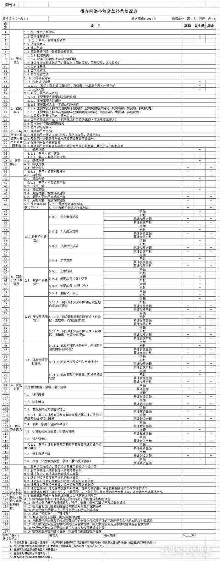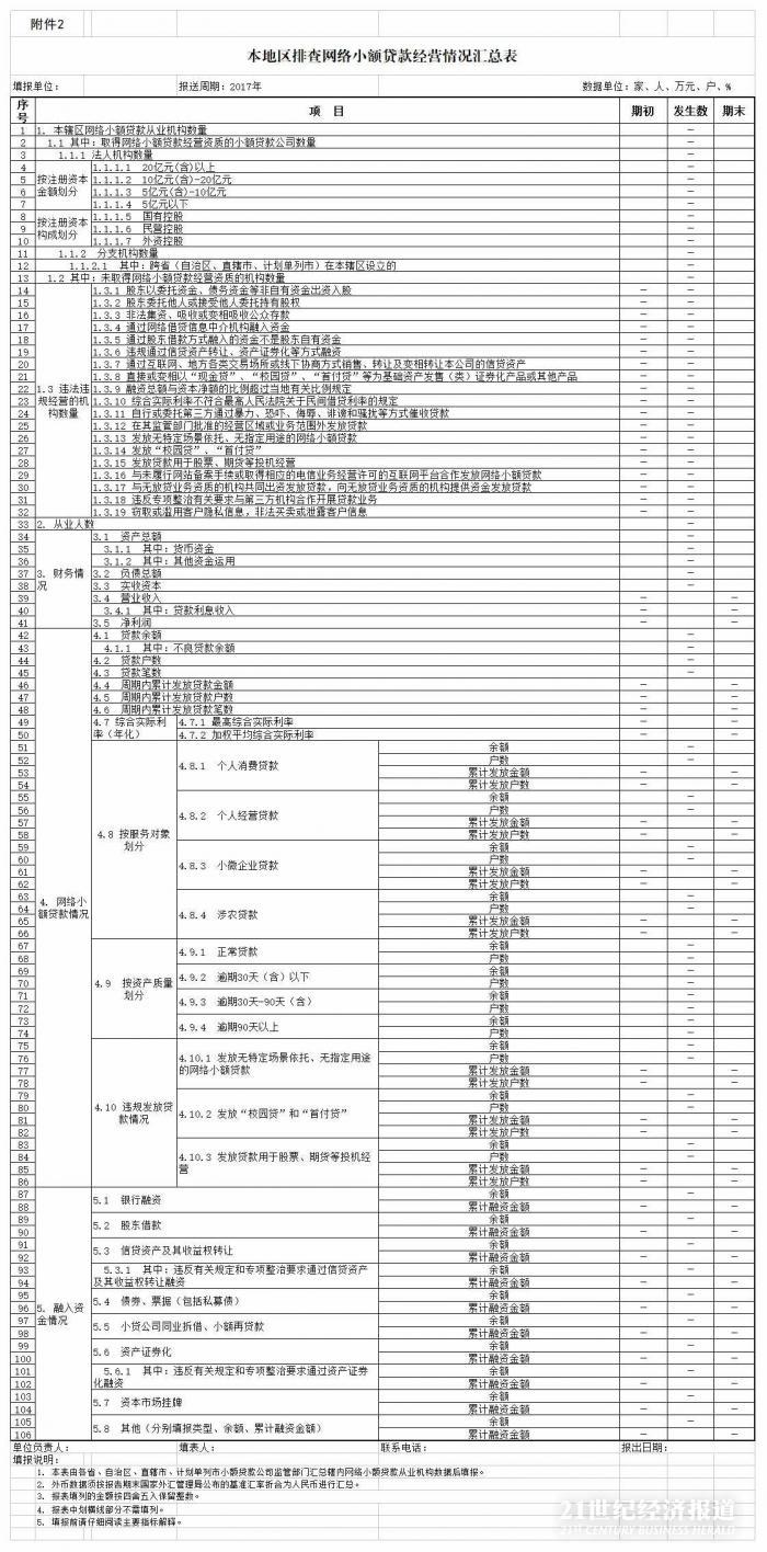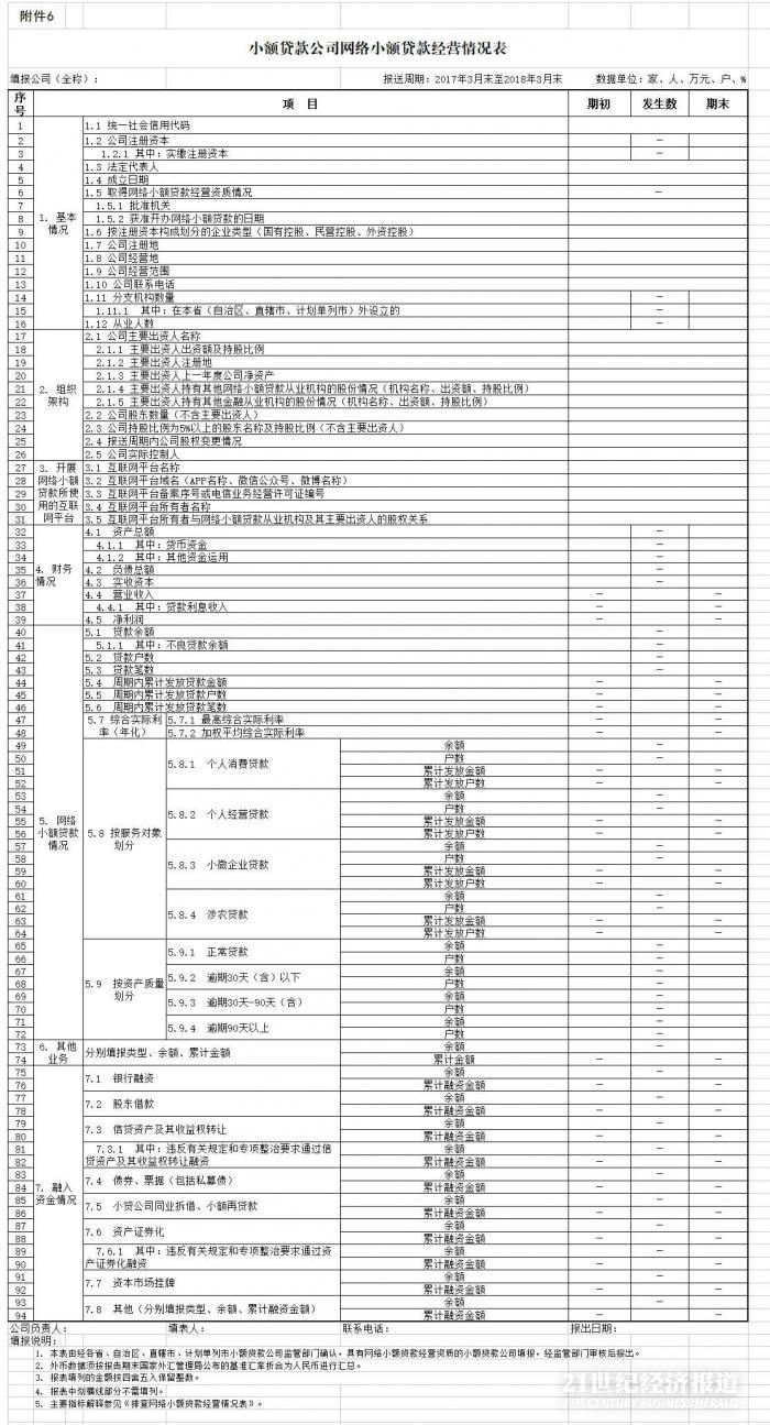4、经各省、自治区、直辖市、计划单列市小额贷款公司监管部门确认,具有网络小额贷款经营资质的小额贷款公司填报,经监管部门审核后报出《小额贷款公司网络小额贷款经营情况表》