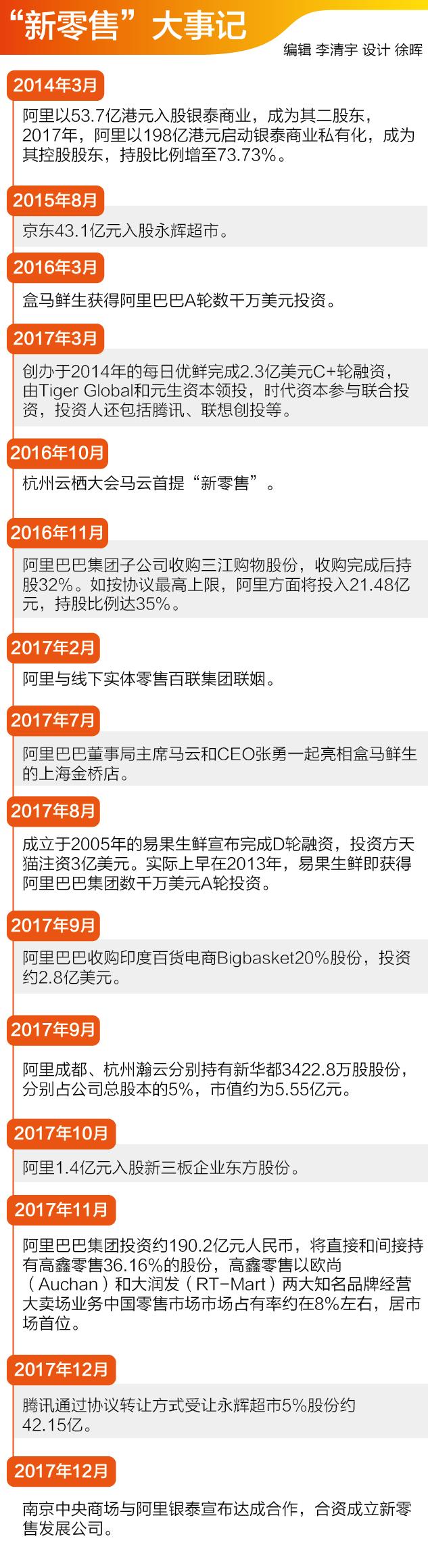 从百货业、3C家电连锁、超市便利店,再到全国最大的商超卖场集团,阿里巴巴推动线上线下融合的新零售进程一脉相承。即以入股的方式建立独家合作,并在移动支付、云计算、物流、大数据等领域提供一整套解决方案。