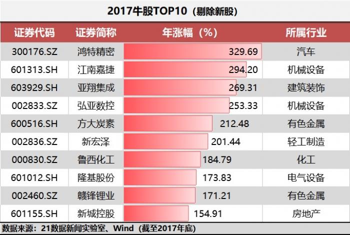 剔除年内上市的次新股来看,有40只个股年度涨幅翻倍,绩优股几乎垄断了2017年牛股TOP10榜单,“特斯拉概念股”鸿特精密、“360借壳股”江南嘉捷受到市场青睐,全年涨幅在3倍左右。数据显示,鸿特精密前三季度净利润同比增长772%,全年业绩预增。而TOP10中的弘亚数控、方大炭素、鲁西化工、赣锋锂业均预计全年业绩将增长,其中,赣锋锂业预增235%,鲁西化工预增541%,而方大炭素前三季度净利润已同比增长25倍。