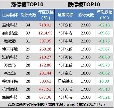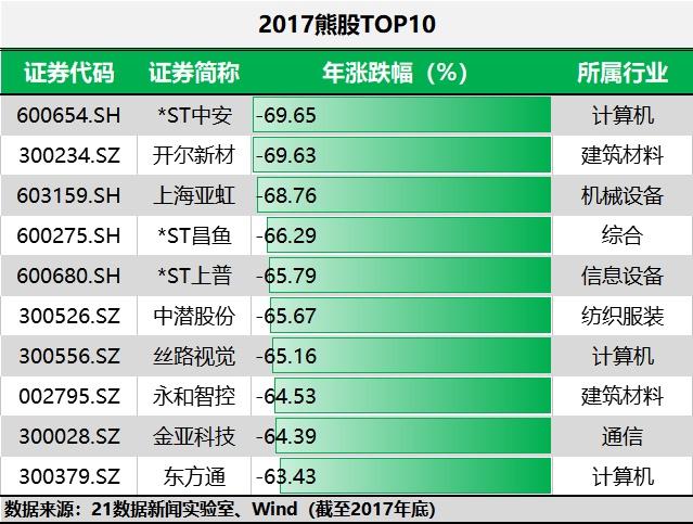 熊股方面,跌幅榜前10竞争可谓相当激烈,据21数据新闻实验室统计,有19只个股2017年跌幅位于60%~70%之间。