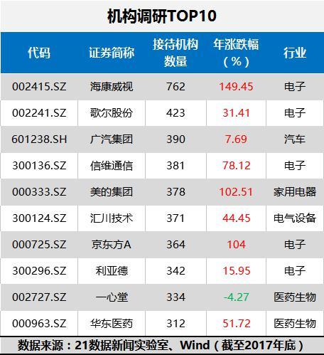 值得注意的是,海康威视也是最受机构关注的个股,2017年累计接待了762家机构的调研,成为人气王。歌尔股份423家紧随其后,其余个股接待机构数量均超过了300家,其中广汽集团为机构调研最频繁个股,2017年共被调研489次,也是唯一一只被调研超百次的个股。