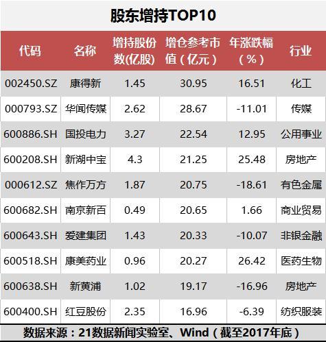 过去一年,虽然“漂亮50”屡创新高,但很多公司股票却持续震荡,多家公司重要股东发布增持计划以提振市场信心。其中,康得新增持力度最大,增持市值超过30亿元,全年涨幅16.51%。但十大增持王中仍有一半个股在2017年是下跌的,焦作万方、新黄浦、华闻传媒、爱建集团均跌超过10%。