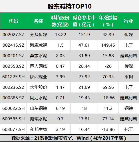 其中,分众传媒2017年减持超过151亿元,位列减持TOP10第一位。行业方面,多集中在建筑材料、传媒、电子。从市场表现看,减持TOP10今年的涨幅都不错,超过50%的有海康威视、海螺水泥、陕西煤业、大华股份。