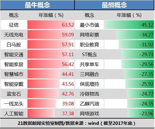 从概念股表现来看,2017年表现最好的板块为征信、无线充电、白马股、智能交通、智能家居,年涨幅均超过50%。
