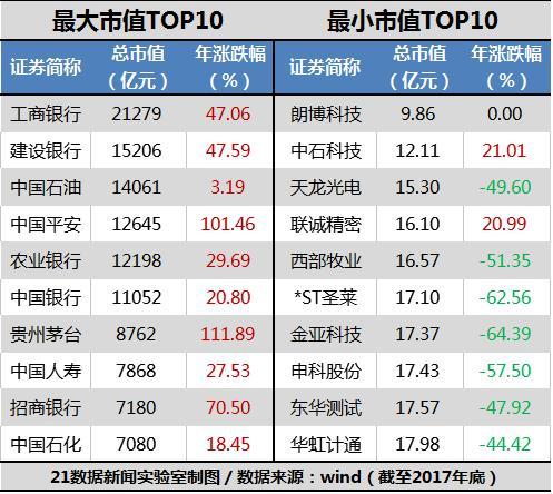 “大而美”、“小烂臭”的风格特征在市值TOP10榜单中表露不遗。统计显示,十大市值巨头年内平均涨幅47.86%。而市值最低的十只股票,除了本周3只新股外,其他今年股价均“腰斩”。