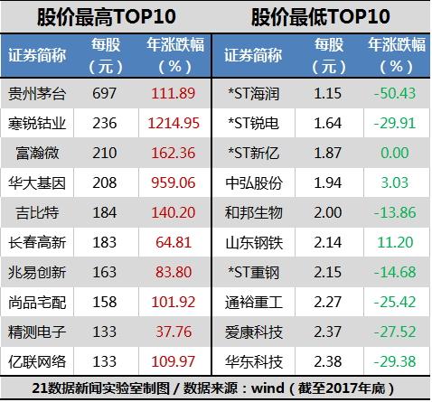 2017年频频吸引眼球的贵州茅台在最后一个交易日,股价和总市值再创历史新高,一度涨至726.5元,总市值超9000亿元。尽管最后跌收697.49元,但仍不妨碍其封神“第一高价股”。此外,今年新上市的寒锐钴业、富瀚微、华大基因股价均超过200元。