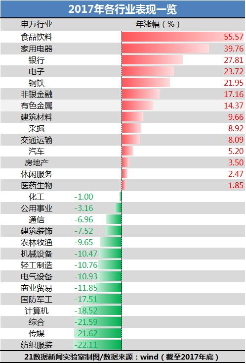 28个申万一级行业中,刚好一半行业年内实现上涨,食品饮料、家用电器排名第一、二位,涨幅分别为55.57%、39.76%。