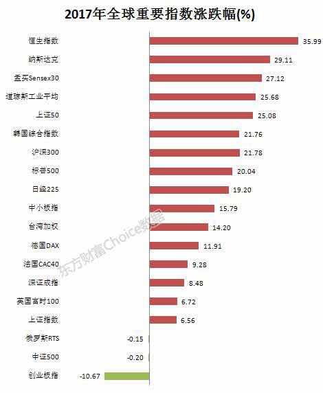 2017年全球市场普遍上扬,恒生指数一马当先,全年上涨35.99%。创业板指处于末尾。
