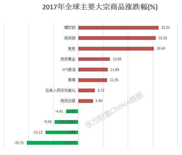 2017年全球主要大宗商品和外汇价格表现中,螺纹钢一马当先,全年上涨32.33%,现货铜紧随其后也涨超三成;现货黄金和原油均涨超10%。
