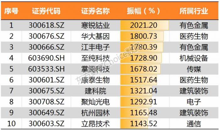 2017年,有色金属板块的寒锐钴业位居振幅榜首位,基因测序板块龙头华大基因以超过18倍的振幅紧随其后。