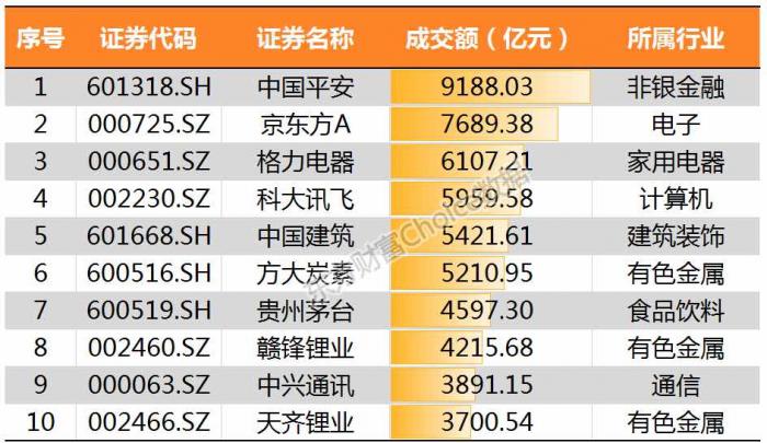 成交额上,中国平安以9188.03亿元的全年累计成交额问鼎两市,其次为京东方A,成交额达到了7689.38亿元,格力电器突破6000亿元位居第三。