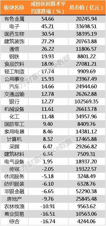行业板块多数上涨,其中有色金属今年涨幅超过50%。