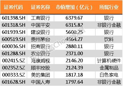 工商银行今年市值增加了6379.67亿元,此外,中国平安、建设银行等市值均增加超过5000亿元。