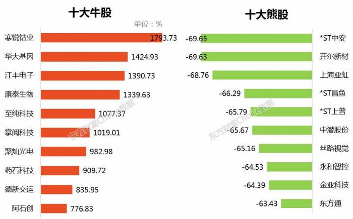 2017年十大牛股中,寒锐钴业以1793.73%的涨幅居首。十大熊股股价全部腰斩,*ST中安年内累计下跌近七成最悲催。