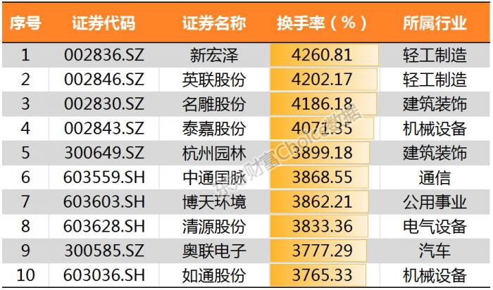 新股新宏泽以42.6倍的换手率高居榜首,英联股份换手率同样超过42倍,位居榜单第二位。