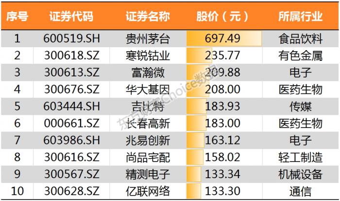 2017年贵州茅台股价接连创下新高,以697.49元的高股价“傲视群雄”,寒锐钴业以235.77元的股价位居第二,富瀚微和华大基因分列第三、第四。