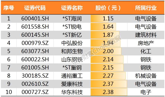 低价股前三全部为ST股,其中*ST海润股价仅为1.15元,成为最廉价的A股。