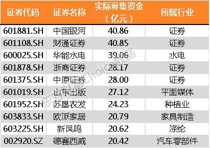 今年的上市的新股与去年相比缺乏50亿以上的大型IPO,与去年一样,今年融资大户前十名中,也有4家是金融股,其中中国银河实际融资40.86亿元居首。
