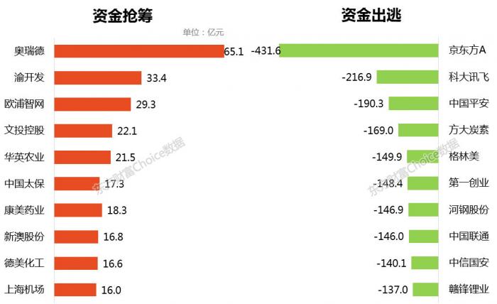 2017年有5只个股全年流入资金超过20亿元,其中奥瑞德居首,渝开发、欧浦智网位列第二、第三。京东方A、科大讯飞等股遭遇资金大举出逃,其中京东方A全年累计流出资金逾430亿元居首。