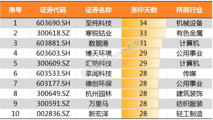 新股至纯科技今年录得34个涨停,位居沪深两市首位,寒锐钴业以33个涨停板的成绩位列其后。