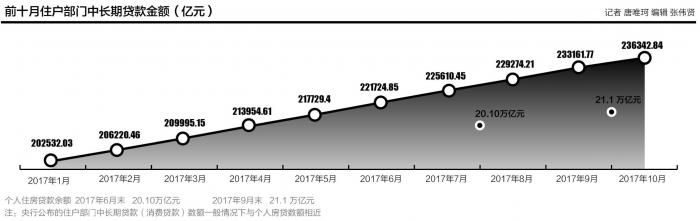 值得关注的是,2017年前三季度,个人房贷与住户部门中长期贷款这两个往年接近的数据,出现了缺口拉大的现象,个人房贷余额增加1.96万亿,中长期贷款增加则达4.2万亿。