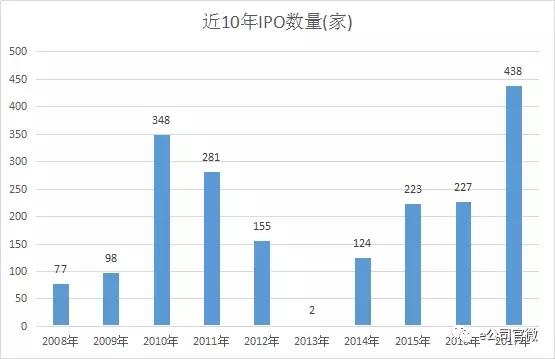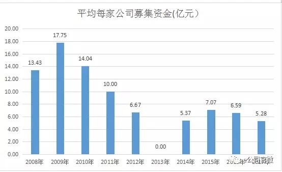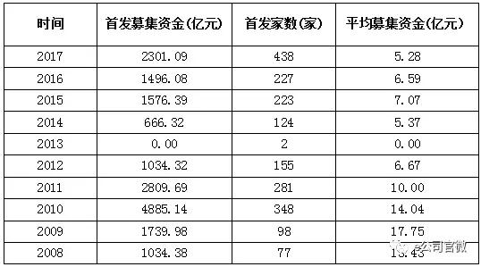 2017年,两市共迎来438家新上市公司,这一数字创出A股市场历史新高。不过,除招商公路、上海环境两家公司外(未发行新股),436家IPO公司累计IPO融资2301亿元,平均每家公司仅融资5.27亿元,这也是最近10年以来(2013年因新股暂停,不计算在内)单家公司平均融资额的新低。